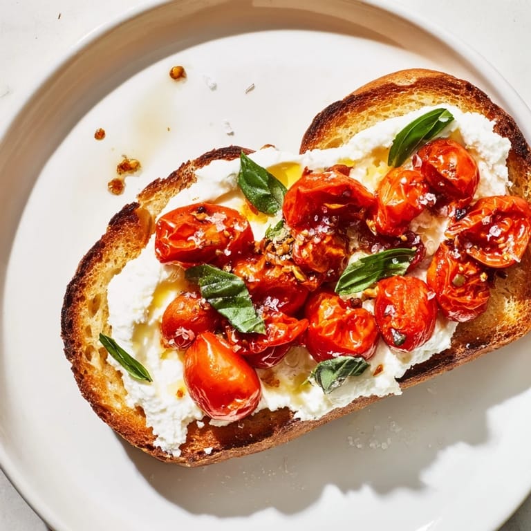 Save I was standing at the farmers market one Sunday morning, staring at a pile of cherry tomatoes so red they looked like they'd been painted. The woman selling them insisted I roast them with just olive oil and salt, nothing else. I bought two pints, went home, and within an hour my kitchen smelled like summer in Italy. That's when this toast was born, and it's been my go-to ever since.