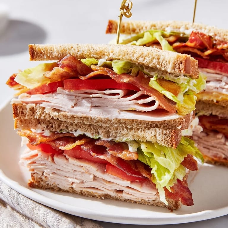 I made these for a friend who showed up unexpectedly during a lazy Sunday, and I remember thinking I only had the basics on hand—some turkey from the deli counter, a couple strips of bacon in the freezer, bread that needed using. By the time I'd assembled the first sandwich and cut it diagonally, they were already pulling up a stool. We ended up spending the whole afternoon talking, and that sandwich somehow felt like the most generous thing I could have offered in that moment.